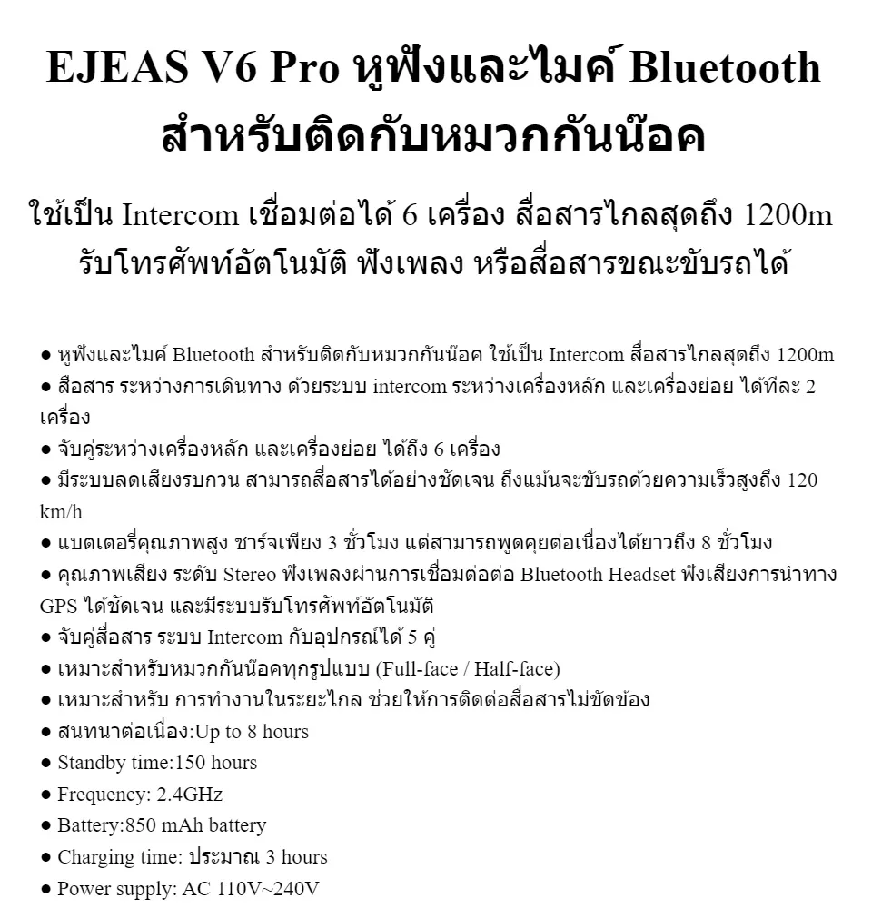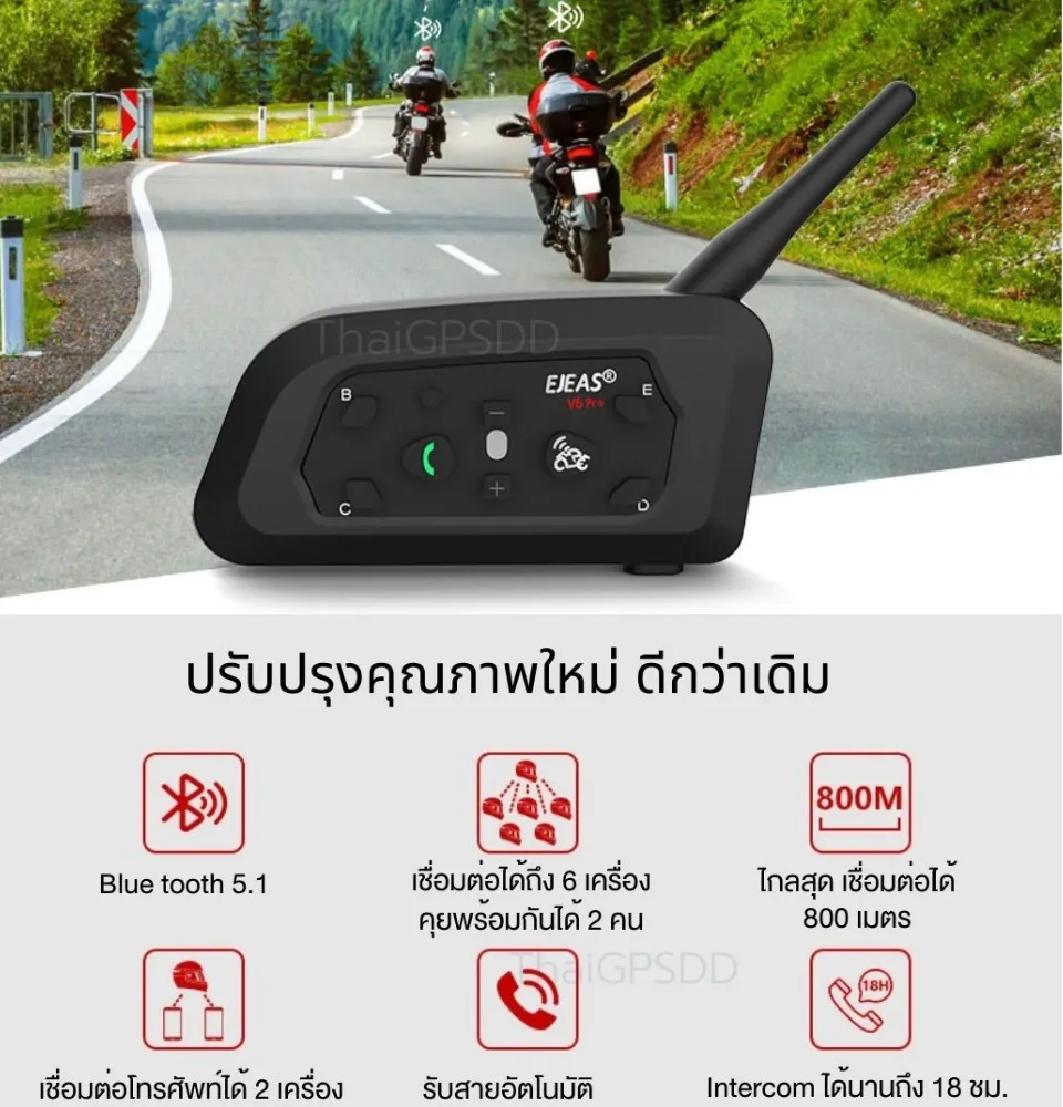 GPSDD EJEAS V6 Pro ชุด Intercom ติดหมวกกันน๊อค เชื่อมต่อบลูทูธ ฟังเพลง รับโทรศัพท์ Intercom เพิ่มได้สูงสุด 6 คน