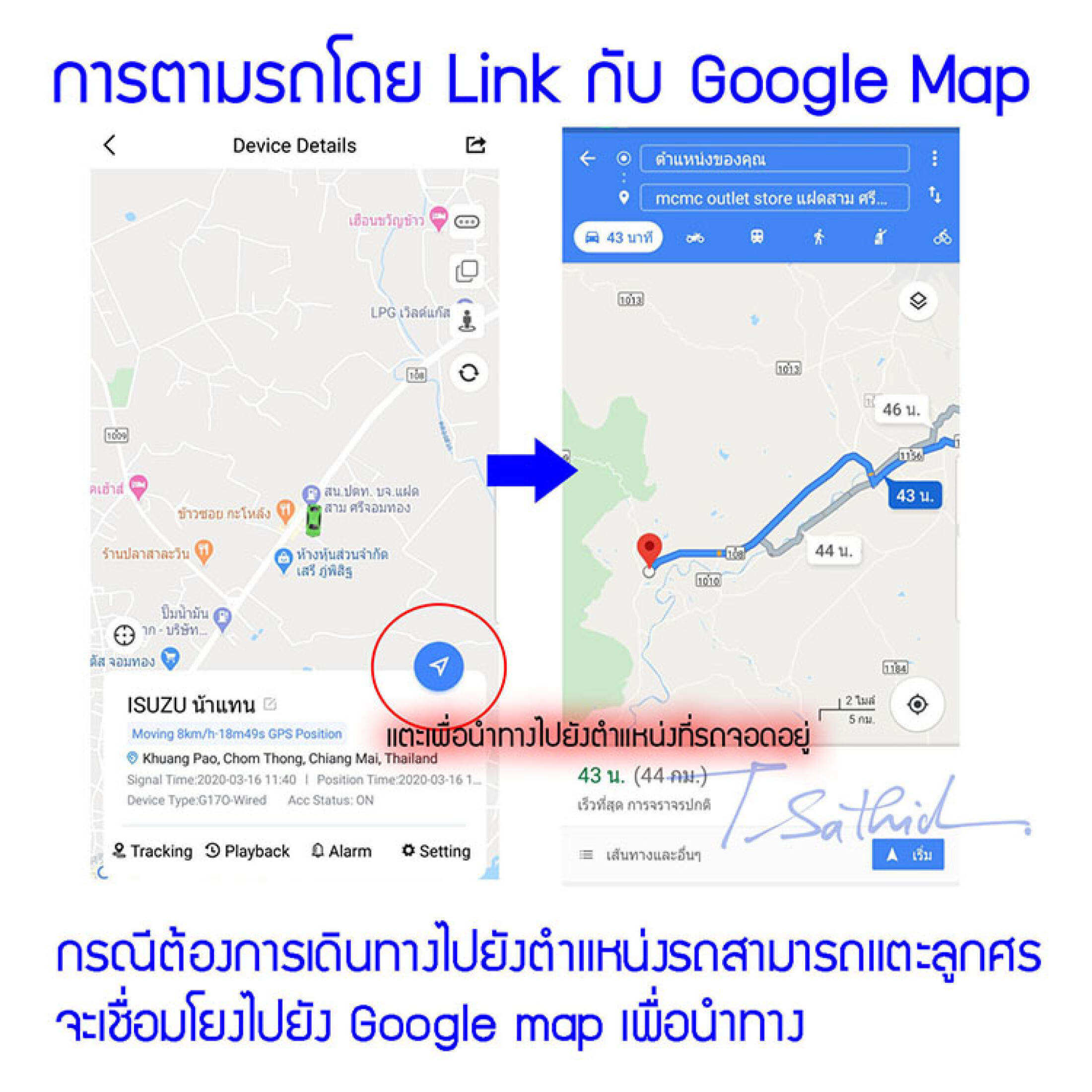 - เชื่อมโยงกับ Google map และสามารถนำทางตามไปยังตำแหน่งรถได้